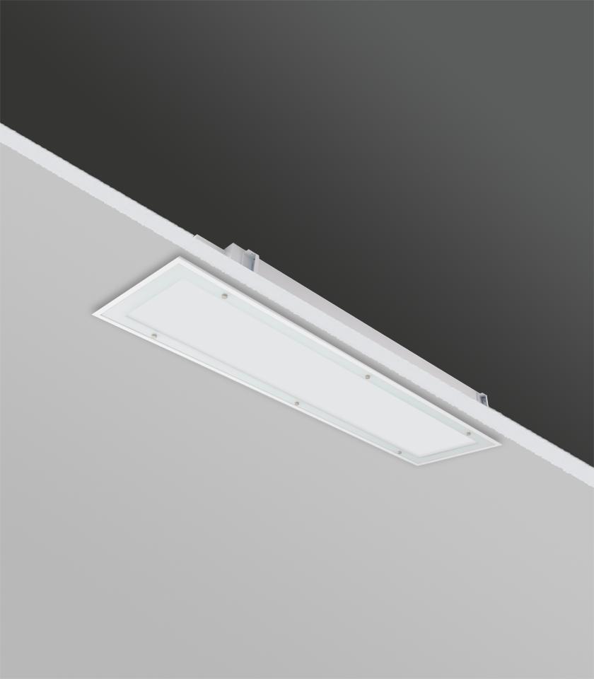 Opal difüzör ve temperli camlı, çerçeve tasarımlı bireysel ve homojen aydınlatma sağlayan gömme steril armatür.