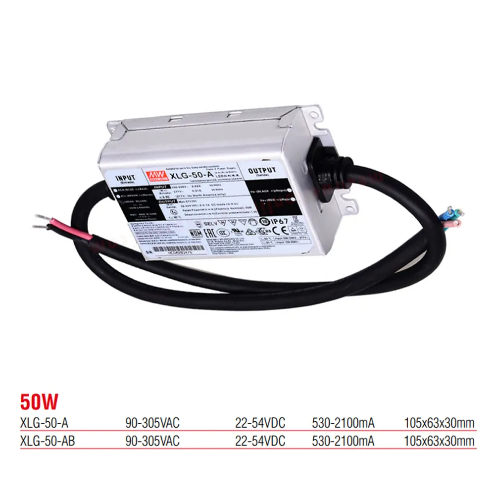 50 W, sabit güç, dalgalanma bağışıklık seviyesi 6 kV, SELV çıkışı ve düşük yüksüz güç ile metal bir muhafaza (IP67) içinde LED anahtarlamalı güç kaynakları. Bu cihazlar dahili bir PFC devresine ve akım limitini ayarlamak için dahili bir potansiyometreye sahiptir ve aşırı yük (otomatik kurtarma), aşırı sıcaklık, kısa devre ve aşırı gerilime karşı korumalıdır. LED aydınlatma uygulamaları için uygundurlar ve EN61347-1, EN61347-2-13, EN62384, EN55015, EN61000-3-2 Sınıf C, EN61000-3-3 ve EN61547 ile uyumludurlar. Kısılabilir olmayan XLG-50-A güç kaynaklarını ve 3'ü 1 arada karartma işlevli (0 - 10V DC, 10V PWM, potansiyometre) XLG-50-AB versiyonunu sunuyoruz.