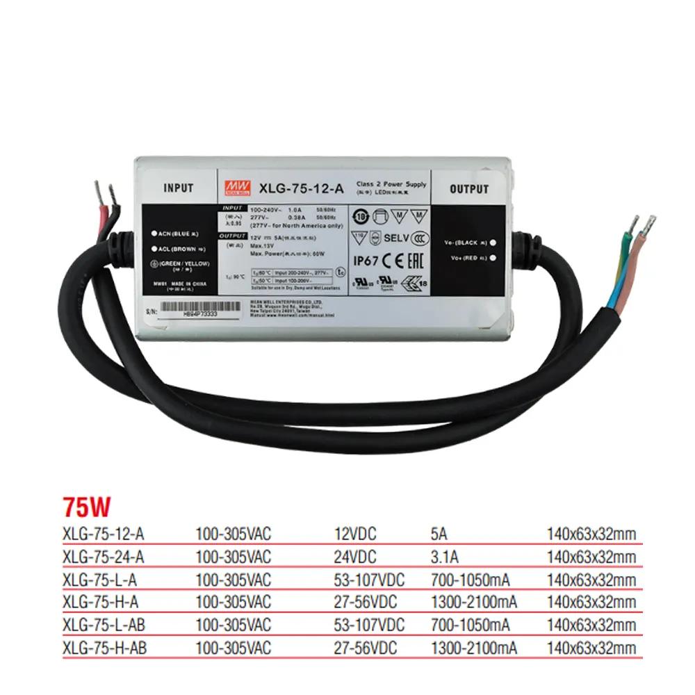 Sabit akım ve sabit voltaj (XLG-75-12/24-A) veya sabit güç (XLG-75-L/HA) ile metal muhafaza (IP67) içinde LED anahtarlamalı güç kaynakları. XLG-75-L/H-AB tiplerinde ayrıca 3'ü 1 arada karartma işlevi bulunur (10V PWM, 0 - 10V DC, potansiyometre). Bu cihazlar ayrıca 100 - 305V AC evrensel giriş, dahili PFC devresi ve düşük yüksüz güç (<0,5W) özelliklerine sahiptir. LED aydınlatma uygulamaları için uygundurlar ve kısa devreye, aşırı akıma, aşırı gerilime, aşırı sıcaklığa ve aşırı yüke karşı akım sınırlaması (otomatik geri kazanım) ile korunurlar. Bu güç kaynakları, EN61347-1, EN61347-2-13 ve EN62384 güvenlik standartlarına, EN55015, EN61000-3-2 Sınıf C, EN61000-3-3 ve EN61547 EMC standartlarına ve 6 kV'a kadar bir dalgalanma bağışıklık düzeyine uygundur. L tipi hariç, tüm versiyonlar SELV uyumludur.